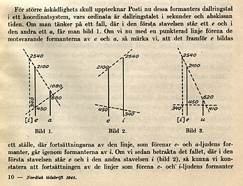 För större åskådlighets skull upptecknar Posti nu dessa formanters dallringstal i ett koordinatsystem, vars ordinata är dallringstalet i sekunder och abskissan tiden. Om man tänker på ett fall, där i den första stavelsen står ett e och i den andra ett a, får man bild 1. Om vi nu med en punkterad linje förena de motsvarande formanterna av e, och a, så märka vi, att det framför e bildas