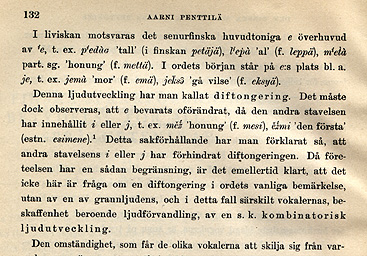 Denna ljudutveckling har man kallat d i f t o n g e r i n g. Det måste dock observeras, att e bevarats oförändrat, då den andra stavelsen har innehållit i eller j, t. ex. mez 'honung' (f. mesi), ezmi 'den första' (estn. esimene).1 Detta sakförhållande har man förklarat så, att andra stavelsens i eller j har förhindrat diftongeringen. Då företeelsen har en sådan begränsning, är det emellertid klart, att det icke här är fråga om en diftongering i ordets vanliga bemärkelse, utan av en av grannljudens, och i detta fall särskilt vokalernas, beskaffenhet beroende ljudförvandling, av en s. k. k o m b i n a t o r i s k l j u d u t v e c k l i n g.