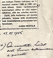 Sanomalehdet ovat kertoneet, niin kuin lukijat ovat panneet merkille, että Västeråsin hiippa- ja maakuntakirjastosta Ruotsista on erään vanhan kirjan kansista löydetty 44 sivua jotakin 1500-luvun suomenkielistä kirjaa. Tieto on siinä suhteessa ollut virheellinen, että sivuja on löydössä 40 eikä 44, ja myöskin siinä suhteessa, että kysymyksessä ei ole yhden kirjan katkelma. Jyväskylän yliopiston kirjaston suosiollisella avulla olen saanut nähdäkseni jäljennökset löytyneistä sivuista ja todennut tämän. Aivan ilmeistä on, että kysymyksessä olevat kansitäytteeksi joutuneet arkit ovat 1500-luvulta. Siihen viittaa arkkien kieliasu, ja sen osoittaa kiistattomasti 8 sivun suhteen myös viimeisen arkinpuolikkaan viimeisen sivun painopaikan ja painovuoden ilmoitus. Kuten kuvasta näkyy, sanotaan siinä: Tulkittu Somen Turus/Mutta paynettu Stocholmisa Amund Lauritzen poijalda Herran syndimen Wodesta 1559". Olisi löydön arvostelemiseksi hyvin tärkeätä olla perillä siitä, minkälaisesta ja milloin sidotusta kirjasta arkit ovat peräisin. Tästä ei minulla ole mitään tietoa. Siitä syystä ja kun käytettävissäni ei ole ollut kuin muutama hetki löydön tutkimiseksi, en voi lausua muuta kuin arveluja, kylIäkin todennäköisiltä tuntuvia arveluja löydettyjen arkkien alkuperästä. Sekä ladelman koko että sisällys samoin myös muu liittymättömyys toisiin arkkeihin osoittaa, että kaksi löytyneistä arkin puolikkaista, yhteensä 8 sivua kuuluu toiseen painotuotteeseen muun osan kuuluessa toiseen. (On siis kysymys kahden kirjan osista.) En voi vastustaa sitä oletusta, että nämä kahdeksan sivua ovat Mikael Agricolan Abckirian eli hänen aapisensa tähän asti tuntemattomat loppusivut. Tästä teoksesta tunnetaan vanhastaan ainoastaan ensimmäinen arkki, vieläpä kahtena eri painoksena. Kun kirjan painopaikka ja -vuosi vanhaan aikaan merkittiin kirjan viimeiseen sivuun, ei meillä ole täysin varmaa tietoa siitä, milloin Agricolan aapisen ensimmäinen ja toinen painos ilmestyivät. Erilaisten tietojen ja kirjapainoteknisten seikkojen perustuksella on pidetty todennäköisenä, että ensimmäinen painos ilmestyi 1543 ja toinen painos 1549. Nyt tehdyn löydön perustuksella on jos mainitut 8 sivua ovat aapisesta nähtävissä, että Agricolan aapisesta ilmestyi vielä kolmaskin painos (vieläpä hänen kuolemansa jälkeen). Kuten viimeisellä sivulla olevasta painopaikan ja -vuoden merkinnästä näkyy, se ilmestyi vuonna 1559. Mielestäni voi olla jokseenkin varma ainakin siitä, että kysymys on Agricolan jonkin teoksen tähän asti tuntemattomasta katkelmasta. Tuskin mikään muu teos voi tulla kysymykseen kuin hänen aapisensa. Suurin osa löytyneestä tekstistä on toisesta kirjasta peräisin ja kirjasta, joka vaivoin voi olla Agricolan käsialaa. Mielestäni ainakin parikymmentä vuotta erottaa sen Agricolan viimeisestä tuotteesta. Varmaan edessämme on Jaakko Finnon eli Jaakko Suomalaisen katkismuksen ensimmäinen painos. Valitettavasti minulla ei vielä ole ollut tilaisuutta kontrolloida tätä oletusta, sillä en ole saanut nähdäkseni vertailumateriaalia. Finnon katkismuksen ensimmäistä painosta ei ole säilynyt muuta kuin jokunen katkelma, toinen painos sen sijaan on tallessa. Asian lopullinen varmistaminen on näin ollen kyllä mahdollinen. Tähänastisen käsityksen mukaan Finnon katkismus on ilmestynyt vuosien 1580 ja 1585 välisenä aikana. Ilman varmistustakin mainitsemani oletus on siksi todennäköinen, että sen uskaltaa mainita. Löytö, jolle kuulemma voi seurata jatkoakin, tarjoaa mitä arvokkainta lisää kirjakielemme syntyvaiheen tuntemukseen. AARNI PENTTILÄ | ![]() |